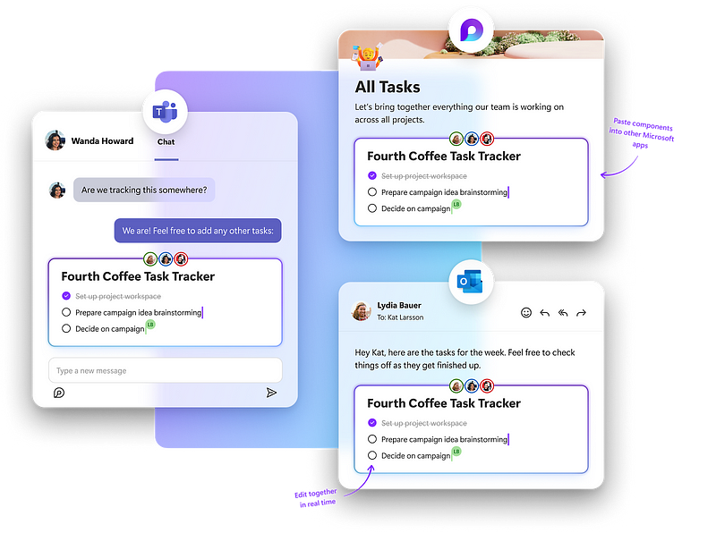 - Components — Probably the coolest 😎 part. There are different types of components: bulleted lists, checklists, numbered lists, paragraphs, tables, voting tables and task lists. All of them can be shared across different 365 apps such as Outlook or Teams. Anyone viewing these components view and edit them in real time across these different apps.